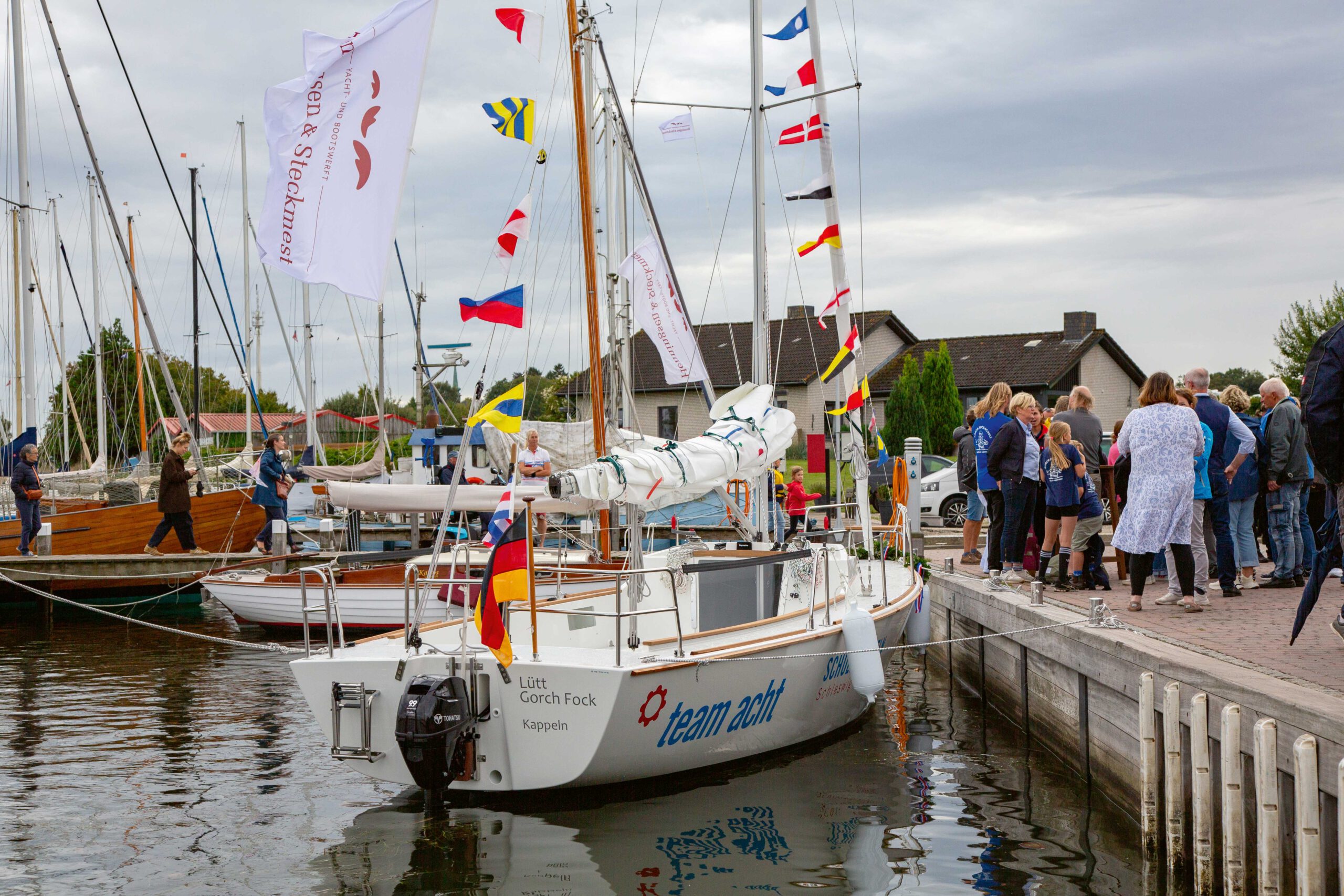 Kappeln. Zahlreiche Zuschauer zog es nachmittags am 11. September 2025 auf das Werftgelände von Henningsen & Steckmest zur stimmungsvollen Taufzeremonie. Die Werft hat es termingerecht geschafft das 10. Boot der team acht Flotte fertigzustellen.